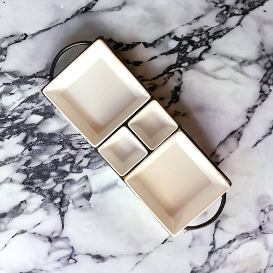 Juego para servir de porcelana, 4 recipientes y base metálica